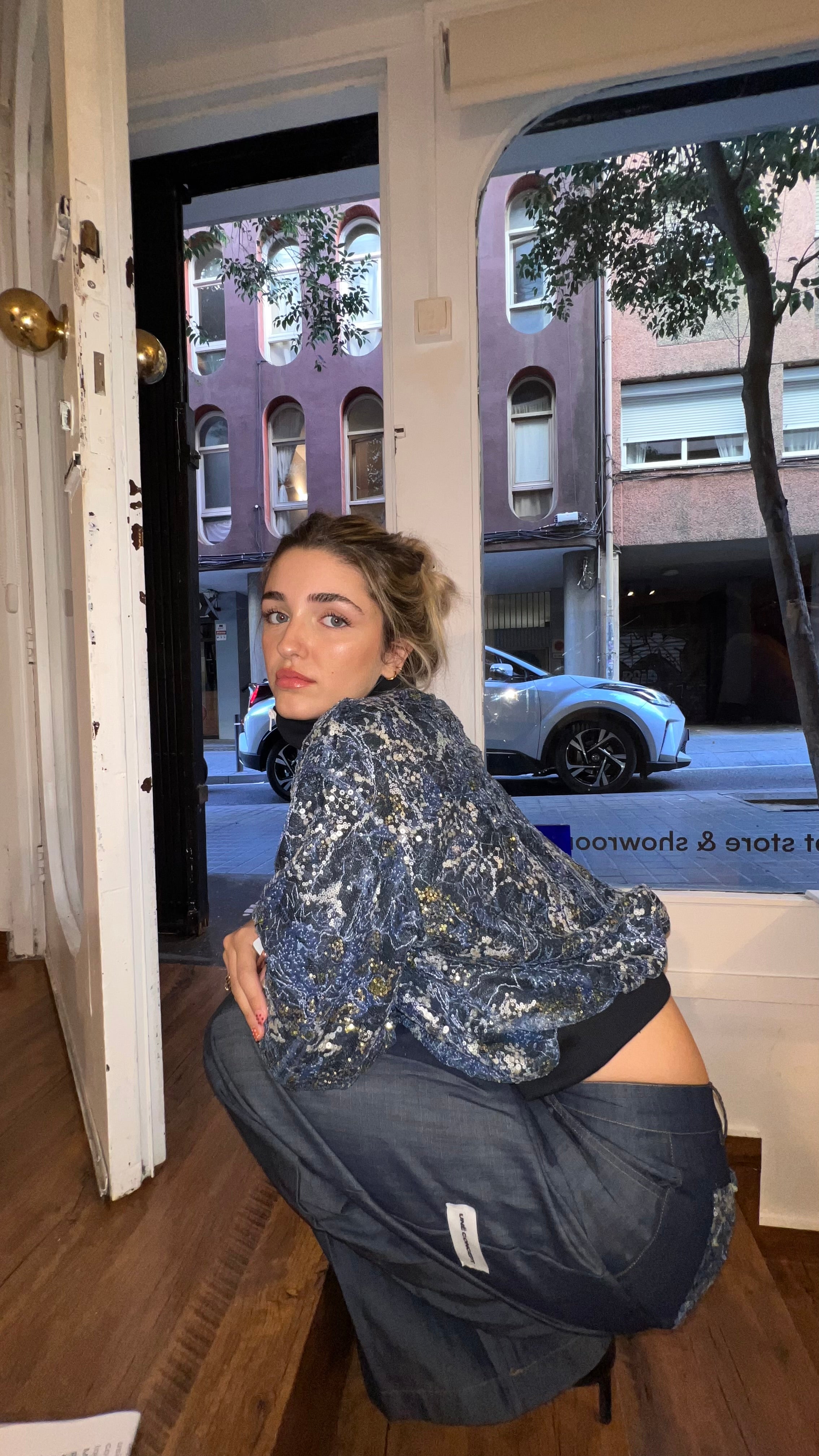 - Low-to-mid-rise, wide-leg baggy jeans. Sequin-lined back pockets.
