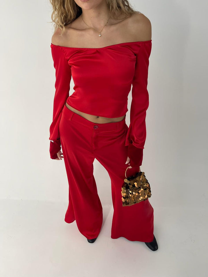 - Pantalón de estilo recto, ancho y desenfadado de color rojo satinado