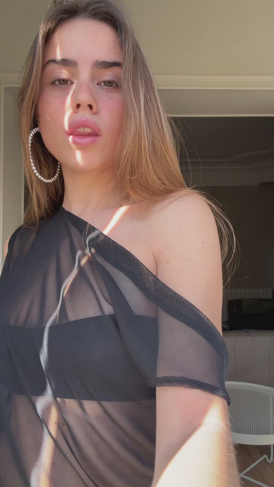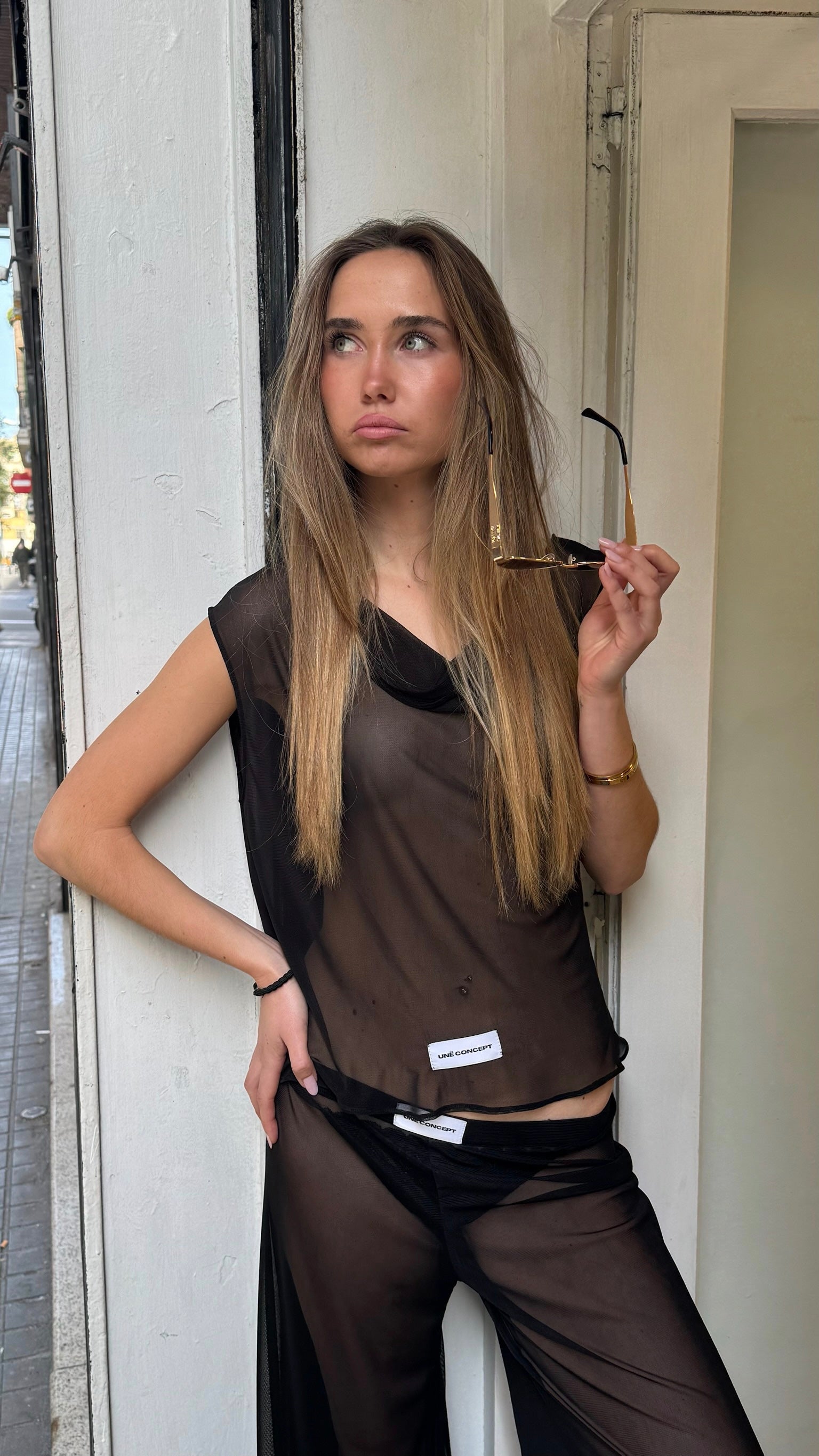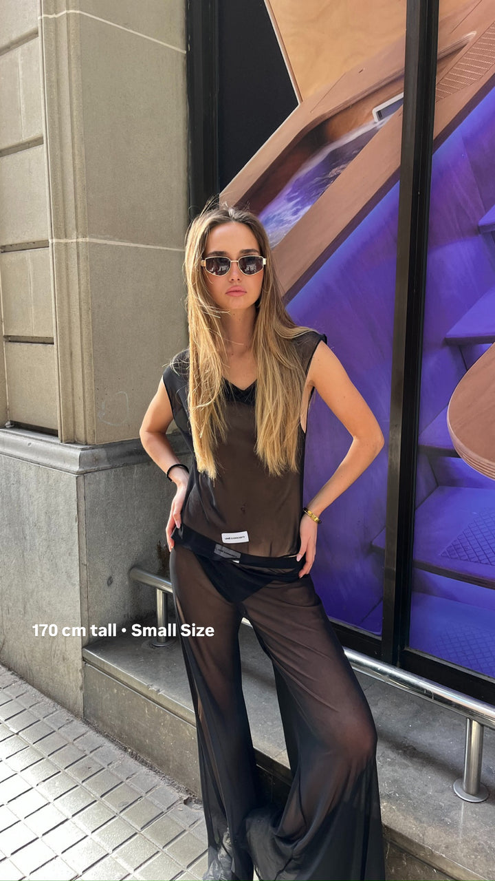 Top de tirantes semi transparente negro. Top con vuelo y movimiento. Cómodo, fresco y sensual.