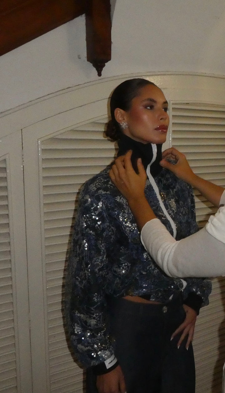 - Chaqueta reversible. Un lado con lentejuela y otra lisa de color azul marino satinado.