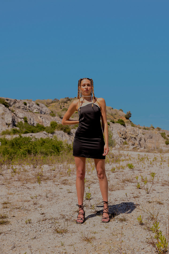 Manuela dress es el vestido negro de la colección SS24 de UNE CONCEPT. Su elegante corte recto y tejido satinado, te aportará elegancia y sofisticalidad. Su patrón estilizará tu figura y te aportará mayor verticalidad.