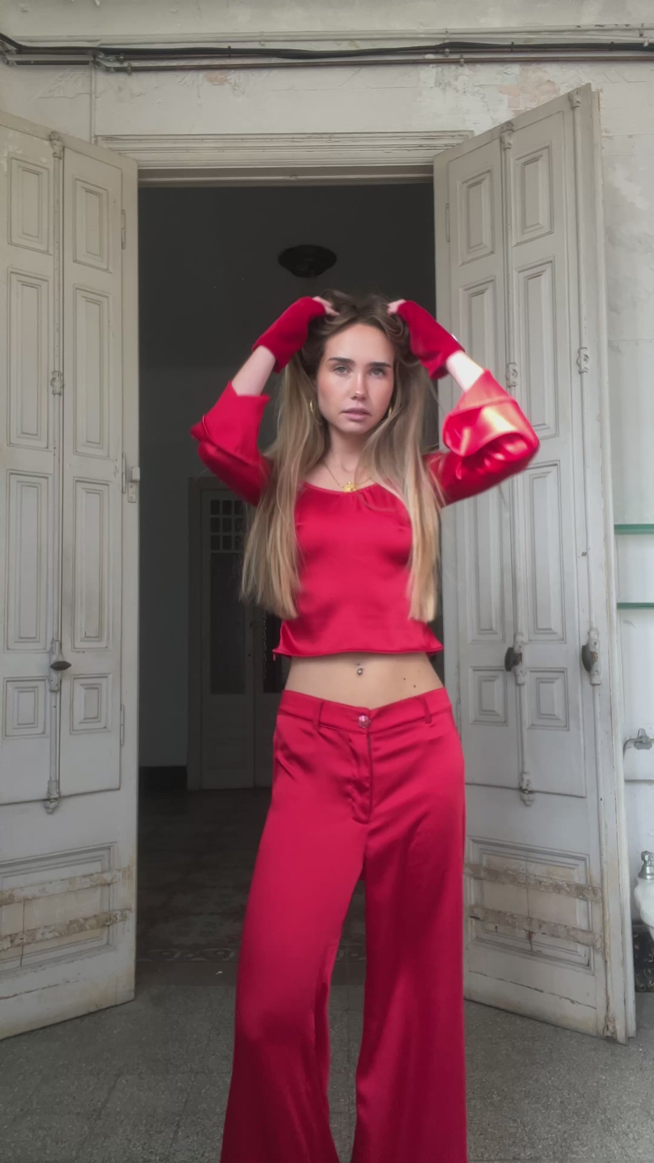 Straight-leg, wide-legged trousers in red satin with a relaxed feel, designed to make a statement without sacrificing lightness. The fabric's fluid drape enhances the color and moves with you, creating a clean, elongated silhouette. They feature a mid-rise waist, a zip and button fastening, and belt loops for a customized fit.
