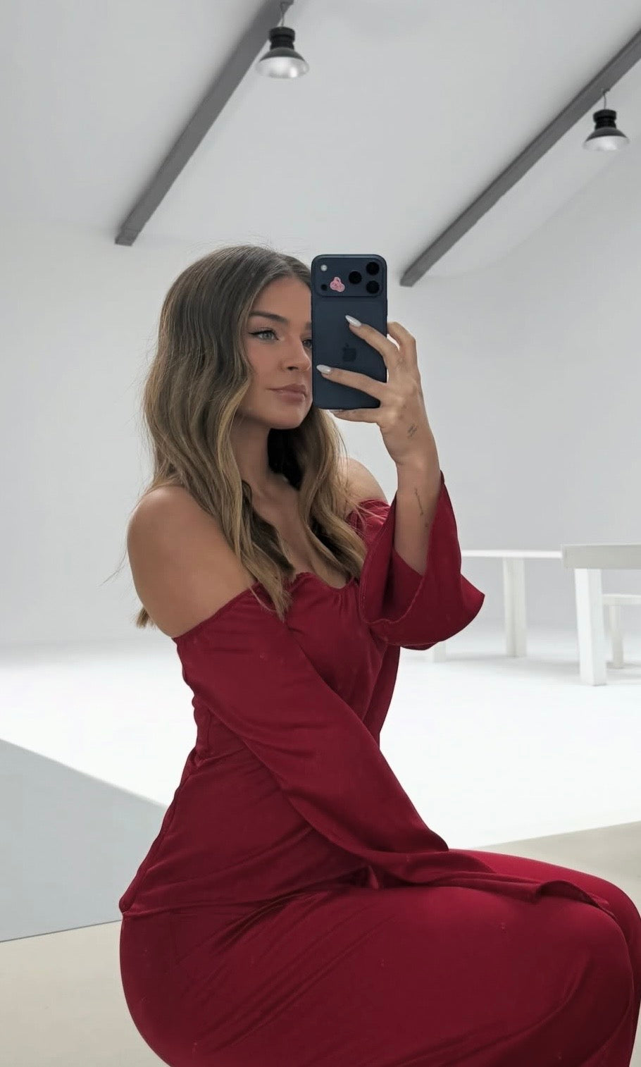 Red satin boat neck top. Composition: 100% PES. Side closure with invisible zipper. Bell sleeves. Straight top, not fitted to the body.